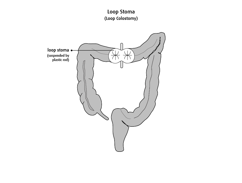 In some cases, your surgeon may choose to create two openings of a stoma. It is most commonly known as a loop stoma. To create this stoma, the surgeon pulls the loop of your bowel out through your abdominal wall. He then cuts the top layer of the loop lengthwise and brings the inner side outward by folding the edges. Those edges are stitched to the abdominal skin. The surgeon may choose to place a plastic rod under the loop to keep the stoma from retracting. This rod is removed 3-10 days after surgery. One of the openings of this stoma will produce stools, while the other will produce mucus.